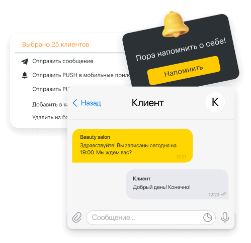 Автоматизируйте напоминания с помощью SMS и push-уведомлений, чтобы свести к минимуму задержки и повысить удовлетворенность клиентов.