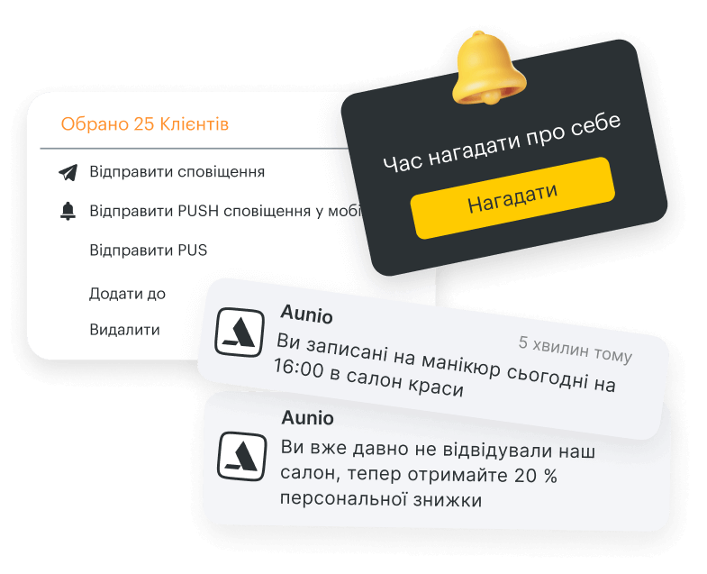 Автоматизуйте нагадування за допомогою SMS та push-повідомлень, щоб мінімізувати затримки та підвищити задоволеність клієнтів.