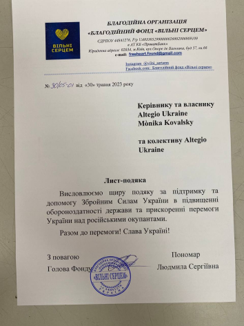 Ми регулярно допомагаємо Збройним Силам України, адже віримо, що тільки разом ми здатні перемогти агресора. Ми щиро робимо свій внесок у велику справу – у справу відновлення та розвитку України. Разом ми будуємо сильну, незалежну та процвітаючу країну!